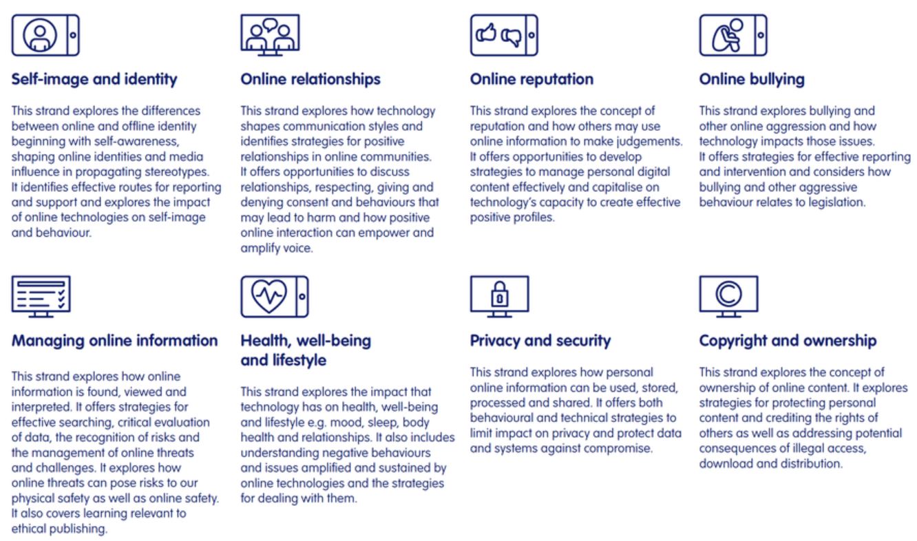 At All Saints, children follow a comprehensive online safety curriculum. This curriculum is supported by resources and materials developed by Project Evolve and is delivered weekly. It focuses on the eight key areas detailed in Education for a Connected World in an age-appropriate manner, outlined in the graphic below.